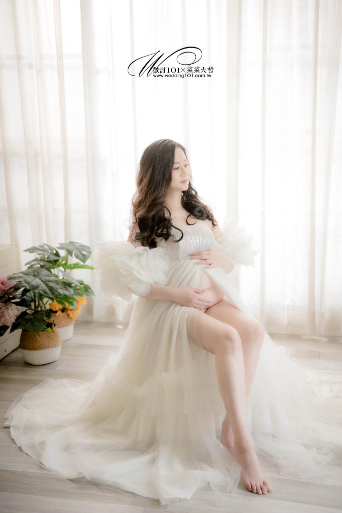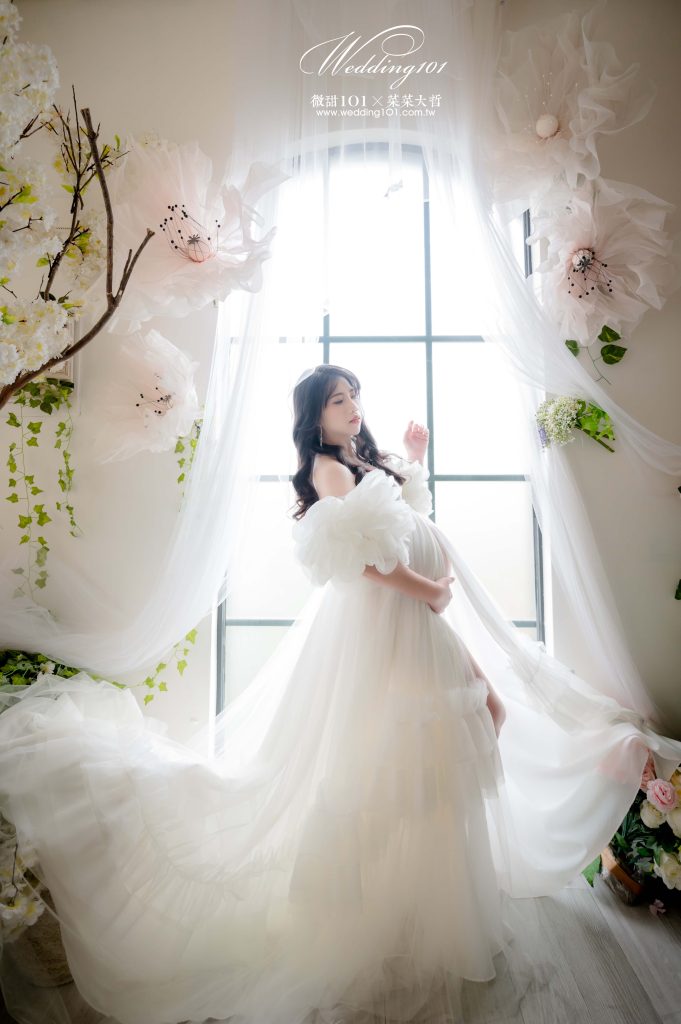 立體花瓣袖設計彷彿春日綻放的花朵,配上自然光灑落的純白紗面,映襯出孕媽的柔和氣質,既唯美又充滿生命力。